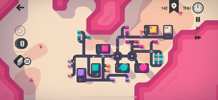 Mini Motorways (2019) is a strategy, city building game, which involves constructing roadways, bridges, and freeways in order to connect drivers from their homes to their destination. As the days pass within the game world and new buildings pop up in increasingly inconvenient places, the city and its roadways grow in complexity until the cars inevitably become too jammed up by traffic, causing the city to grind to a halt.