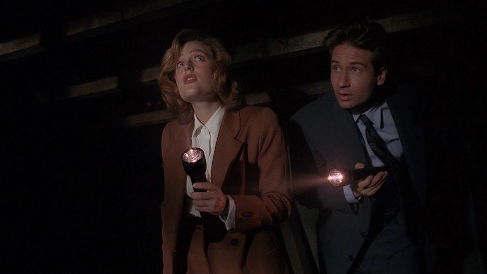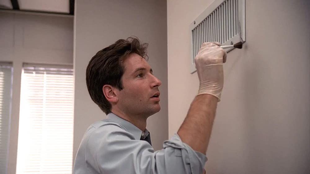 Scully sends him away annoyed — but as he’s leaving, he noticed something big enough to be a person moving in the vents. Mulder runs back to get Scully and have her call for back up.